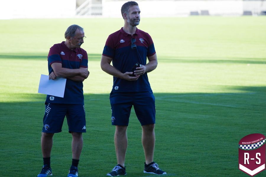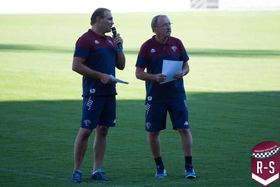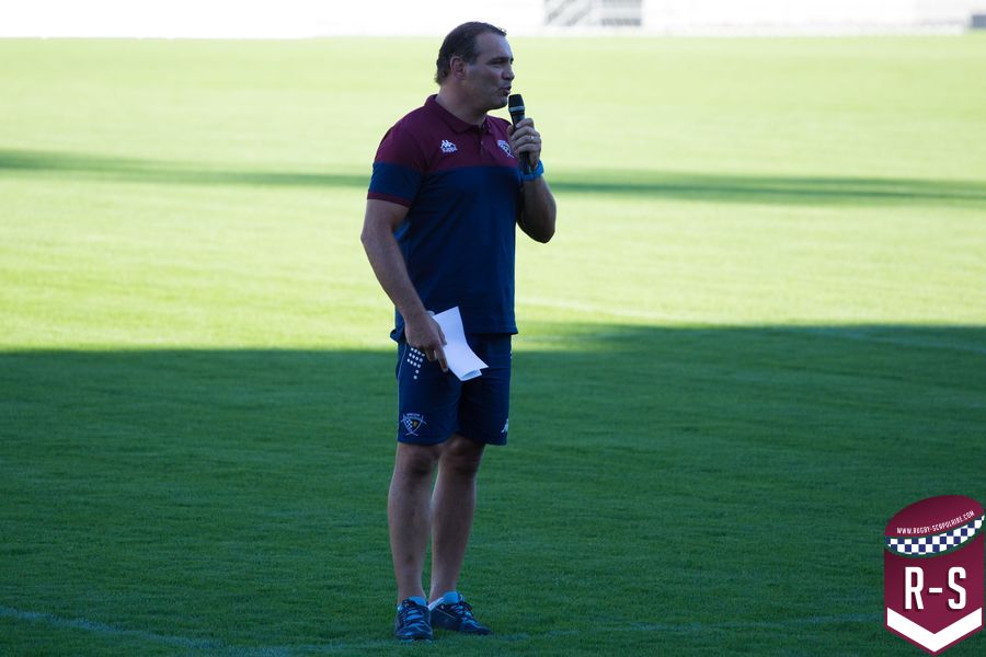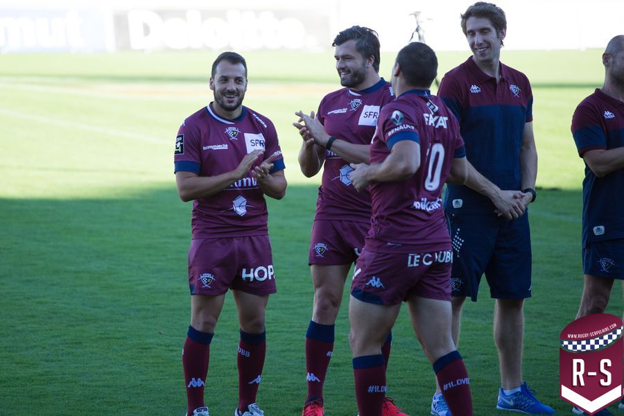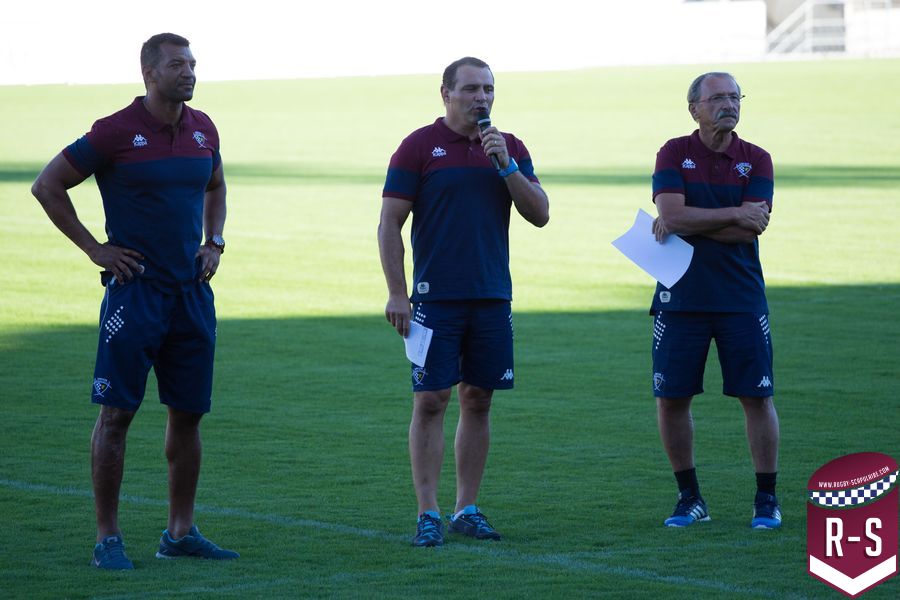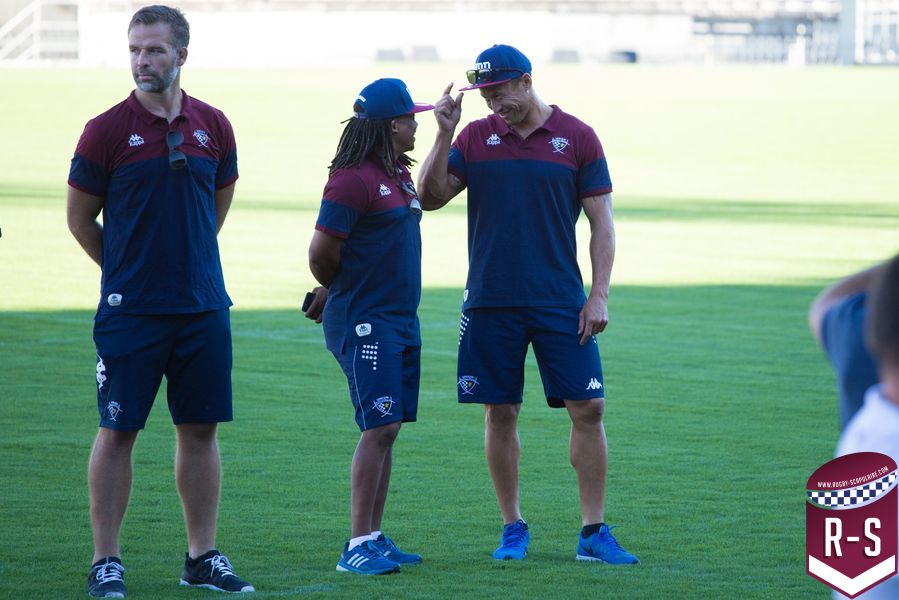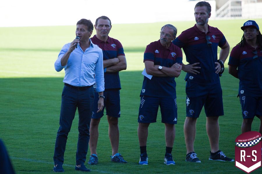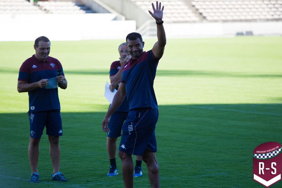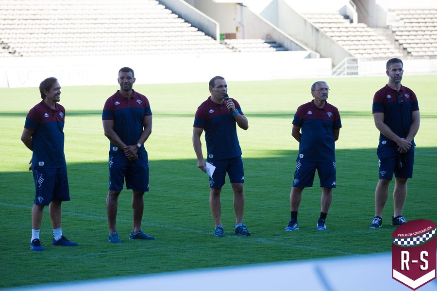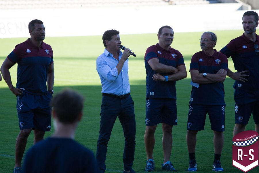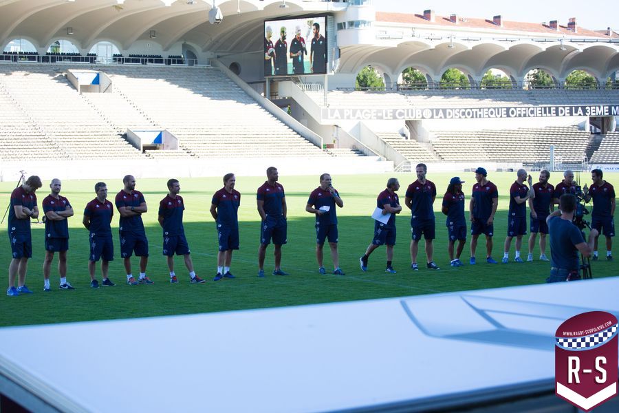 C’est ensuite Raphaël Ibanez qui est entré le premier pour présenter son staff. En commençant par le nouvel arrivé Jacques Brunel, qui s’occupe des avants, suivi d’Émile Ntamack pour les arrières et de Joe Worsey pour la défense. Il y a aussi eu Heini Adams et Bruce Reihana en charge de la technique individuelle. Puis la cellule de préparation physique avec Ludovic Loustau, Sébastien Danthez et Cyril Gomez ; l’équipe médicale avec Damien Monnot, le nouveau médecin de l’UBB, ancien médecin de l’équipe U20 qui arrive de Lyon et l’équipe de kinés autour de Loïc Arnoul. Il y avait enfin l’analyste vidéo Serge Fourquet ainsi que l’équipe de la coordination et de l’intendance sportive avec Jean-Baptiste Fourcade, Alphose Miralles, Boris Julie et Alain Bria.