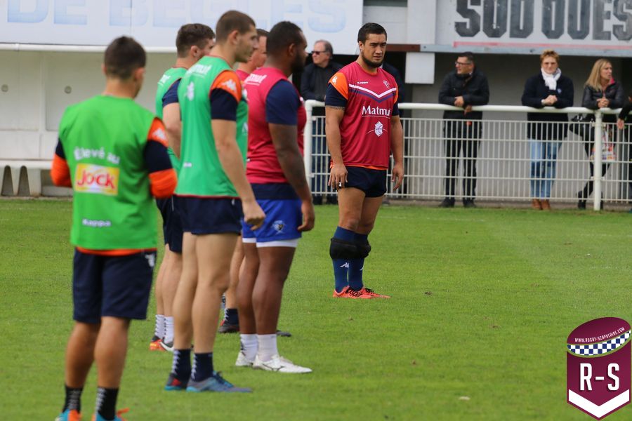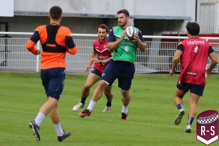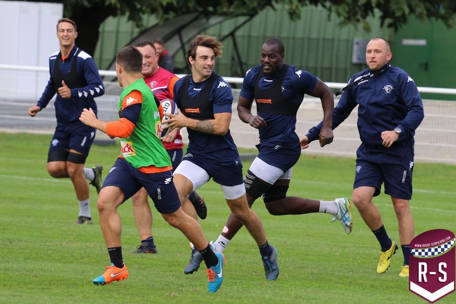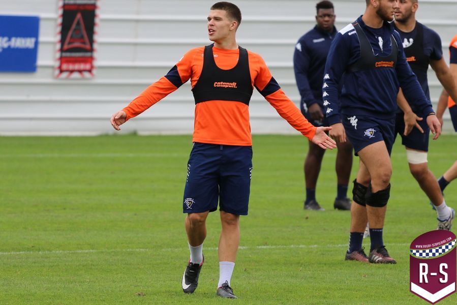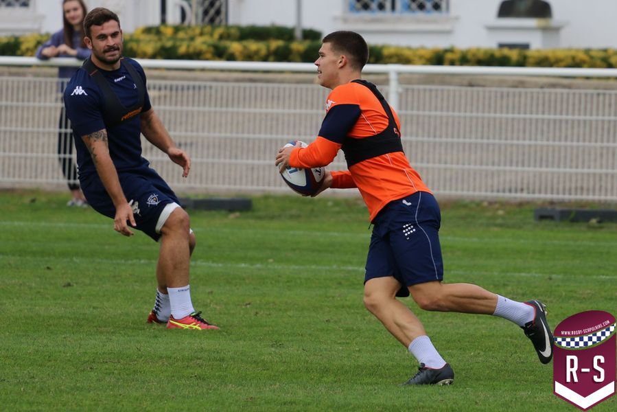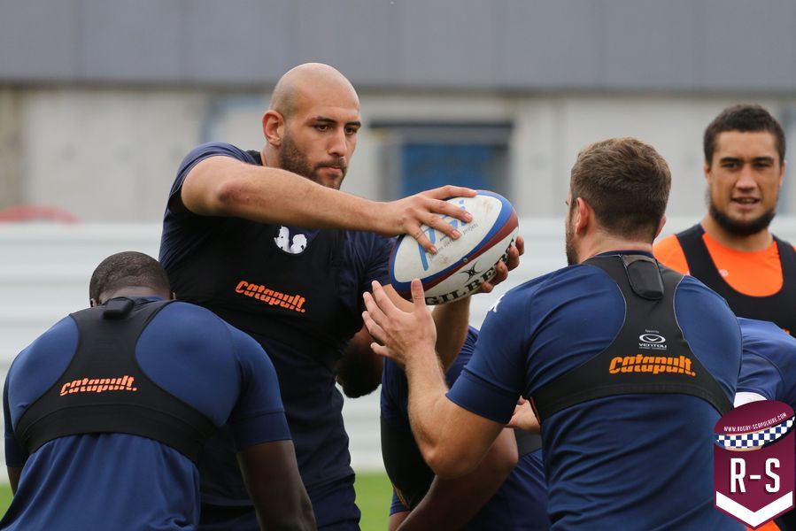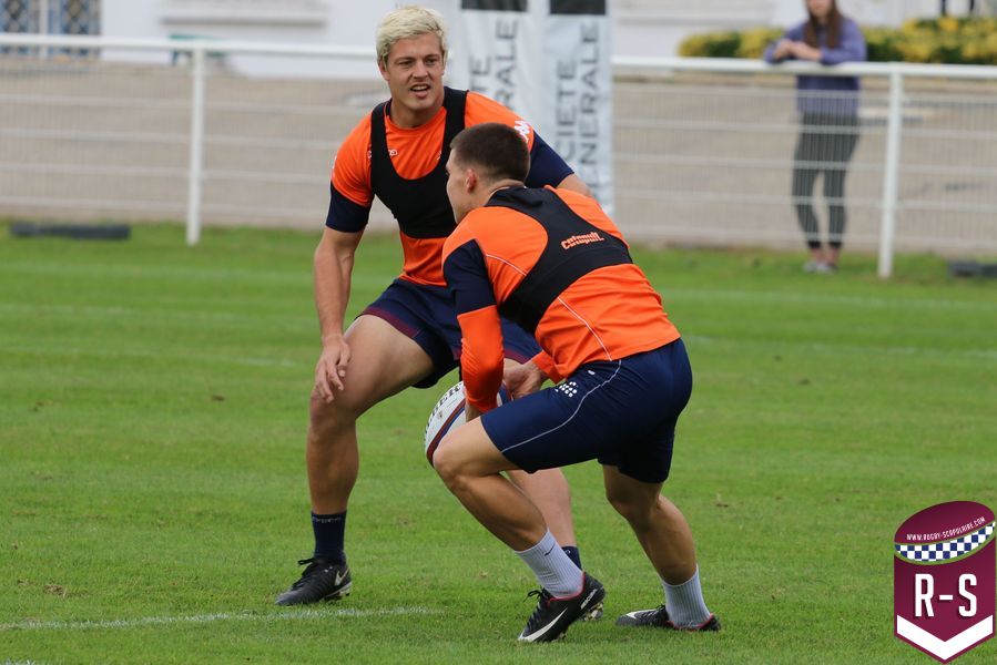 Nous étions présents à la séance d’entraînement du jour pour voir le début de la préparation du déplacement au Racing 92. Les joueurs étaient séparés en deux groupes. L’un était avec l’entraîneur des avants, Jeremy Davidson et l’autre avec Rory Teague, réalisait une opposition sur petit terrain, où le but était de marquer rapidement un essai. Les joueurs devaient s’arrêter dès qu’ils étaient touchés. Voici quelques photos de cet atelier.