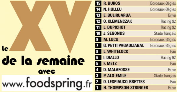 Après la victoire de l’UBB face à Clermont sur le terrain du Stade Marcel Michelin, quatre joueurs de l’UBB figurent dans le XV de la semaine du Midi Olympique. Il s’agit de notre arrière, Romain Buros, notre ailier, Nathanaël Hulleu, notre demi de mêlée, Maxime Lucu et notre troisième ligne, Guido Petti.