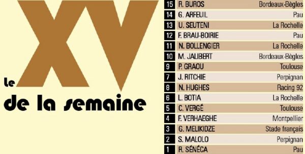 Comme après chaque week-end de compétition, la rédaction de Midi Olympique nous livre son XV type de la semaine. A la faveur de leur large victoire face à Toulon en clôture de la douzième journée, on y retrouve deux joueurs de l’Union Bordeaux-Bègles. Il s’agit de notre arrière international, Romain Buros et de notre demi d’ouverture international, Matthieu Jalibert. On peut également noter la présence de notre ancien trois-quarts centre, aujourd’hui du côté du Stade Rochelais, Ulupano Seuteni.