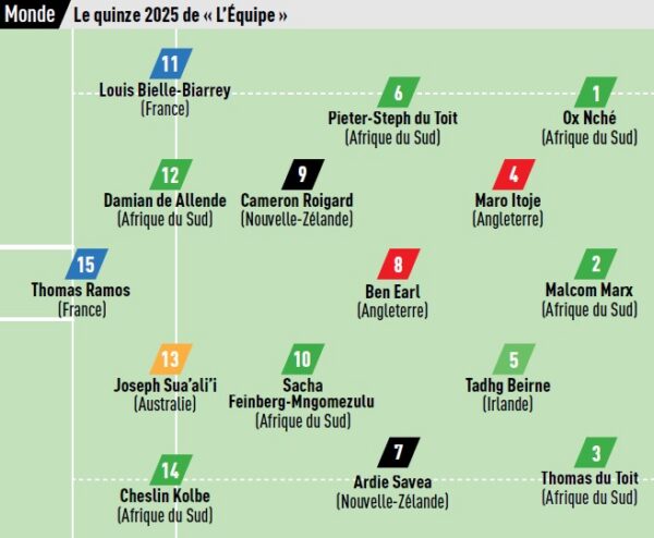 Alors que l’année 2025 s’est terminée, la rédaction de L’Equipe nous livre son XV Monde. Parmi les joueurs retenus, on retrouve un joueur de l’Union Bordeaux-Bègles, qui fait partie des deux joueurs français retenus. Il s’agit de notre ailier international, Louis Bielle-Biarrey. Il est en compagnie de Thomas Ramos.