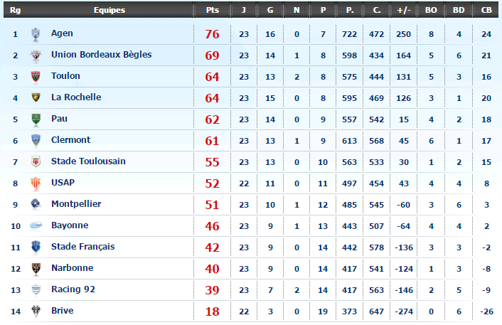 Après la victoire contre le Stade Toulousain, il ne reste plus que 3 journées à disputer à nos jeunes espoirs (déplacement au Stade Français, réception de Perpignan, déplacement à Clermont). Avec 14 points d’avance sur le 7ème Toulouse à 3 journées de la fin, 1 seul point est nécessaire pour assurer sa place en phases finales. Mais l’objectif est de rester à la seconde place du classement pour éviter un match de barrage supplémentaire. Nos jeunes possèdent une victoire bonifié d’avance sur le 3ème Toulon.