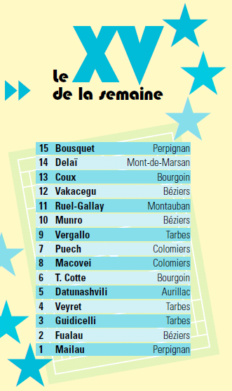 Notre ancien demi d’ouverture Lachie Munro, aujourd’hui à Béziers, figure dans l’équipe type de la semaine pour la Pro D2 du Midi Olympique. Auteur de 3 transformations et 2 pénalités, il a aussi contribué à la victoire de son équipe contre Albi (27-8) en dirigeant une ligne de 3/4 en grande forme. Actuel 4ème, Béziers semble en bonne position pour jouer les demi-finales d’accession.