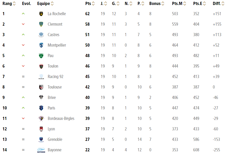 Top 14, phase retour @staderochelais 1er, 26 pts/30 possibles; @UBBrugby 14ème, 5 pts/30
