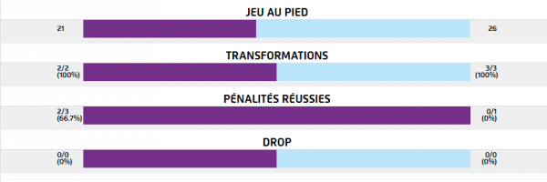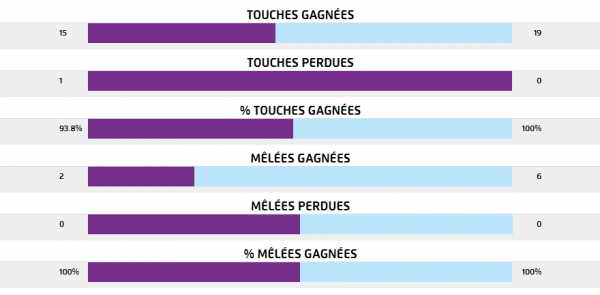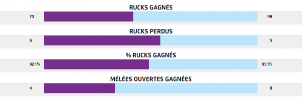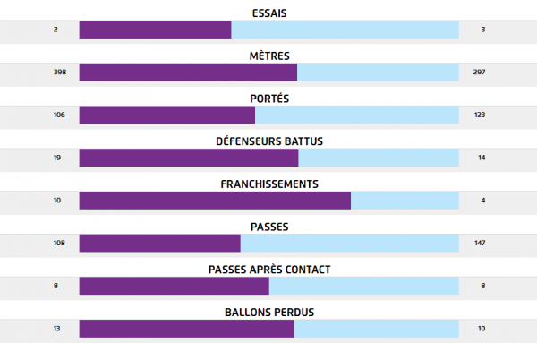 Du côté des statistiques individuelles, on peut noter les 73m parcourus ballon en main par Marco Tauleigne et les 72 de Matthieu Jalibert, les 14 ballons portés par Nans Ducuing, les 4 défenseurs battus par Adrien Pélissié. On peut aussi noter la grosse activité de la 3ème ligne avec respectivement 17, 14 et 18 plaquages réalisés par Marco Tauleigne, Alexandre Roumat et Leroy Houston. Luke Jones a aussi plaqué 14 fois. Entré à la 54ème, Thierry Paiva a réalisé 10 plaquages. Luke Jones a été la solution numéro 1 en touche avec 6 ballons pris.