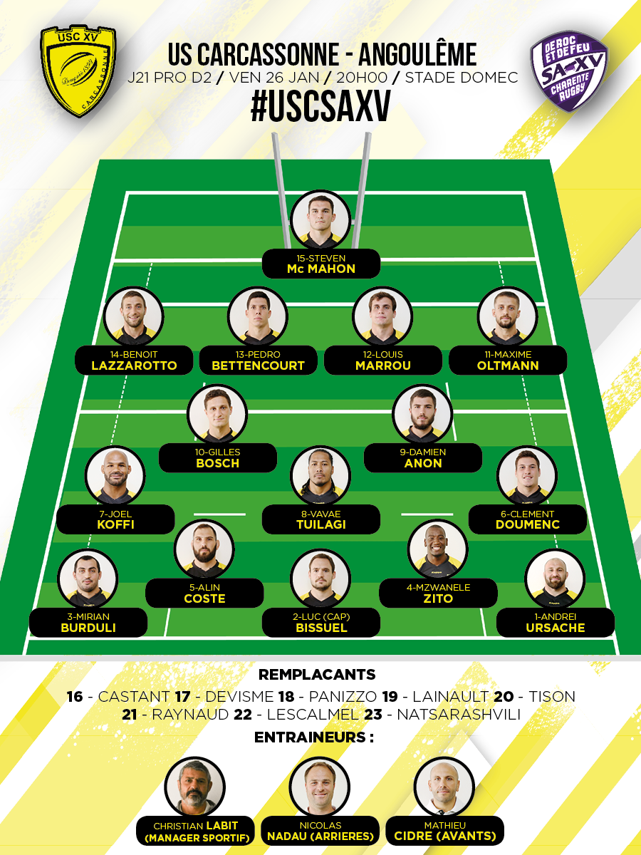 Ce soir Carcassonne, toujours dernier de Pro D2, reçoit le SA XV, 9ème du classement, dans son Stade Domec. Pour cette rencontre nos deux jeunes prêtés, Gauthier Bruté de Rémur et Xerom Civil, ne seront pas sur la feuille de match.