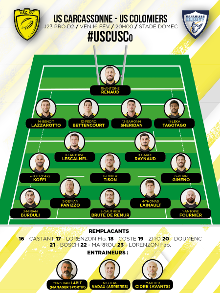 Pour la 23ème journée de Pro D2, Carcassonne reçoit Colomiers, 6ème au classement, au Stade Domec à 20h. Pour cette rencontre, les Audois, qui restent sur 3 victoires consécutives et tenteront de continuer leur belle série, débuteront le match avec notre jeune talonneur, Gauthier Bruté de Rémur parmi les titulaires. Xerom Civil ne figure par contre pas dans le groupe puisque retenu en sélection espagnole.