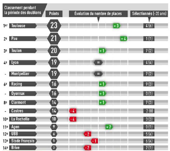 Comptant jusqu’à 9 internationaux durant les périodes de doublons du Tournoi des 6 Nations, l’UBB pointe à la 12ème place d’un classement réalisé sur cette période par l’Equipe. Elle a par ailleurs perdu deux places au classement.