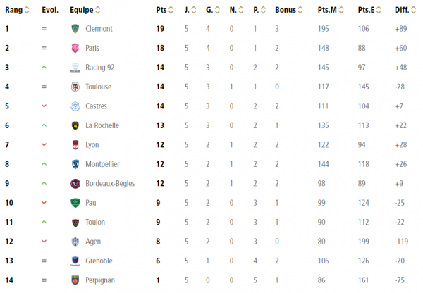 Après sa belle victoire contre Clermont, l’UBB gagne une place au classement et remonte à la 9ème place du Top 14. Elle est à égalité de points avec Montpellier et Lyon qui occupe les deux places de devant et pointe à un point du Stade Rochelais, son prochain adversaire, qui occupe la place de 6ème. Dans un classement plus serré que jamais, le Racing, 3ème, n’est qu’à 2 points. Une victoire à domicile contre le Stade Rochelais samedi prochain sera importante pour confirmer l’embellie.