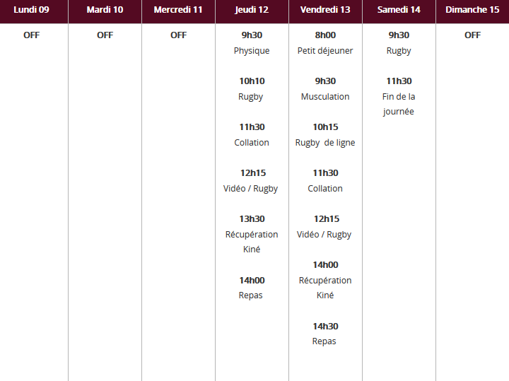 Romain D. Romain 9/02 - 8h00 Le planning de la semaine 7 Voici le programme d’entrainements de cette semaine. De retour de stage à la montagne, les joueurs de l’UBB bénéficient comme prévu de repos jusqu’à mercredi inclus. Ils retrouvent ainsi le chemin de Moga jeudi, et s’entraineront jusqu’à samedi.