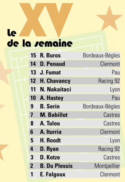 Après la victoire acquise ce samedi au Matmut Atlantique contre le Stade Rochelais, deux joueurs de l’UBB figurent dans le XV de la semaine réalisé par les équipes du Midi Olympique. Il s’agit de notre arrière, Romain Buros, et de notre demi de mêlée, Baptiste Serin. Félicitations à eux.