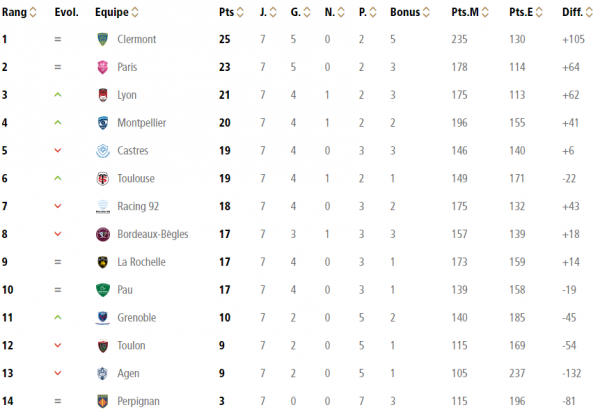 Avant de laisser le Top 14 et côté pendant les deux prochaines semaines pour se consacrer à la Challenge Cup, l’UBB pointe à la 8ème place après sa défaite bonifiée contre Grenoble, ce samedi au Stade des Alpes. Avec 17 points, elle n’est qu’à 2 points du 6ème, le Stade Toulousain et 4 points de son futur adversaire, Lyon, actuel 3ème.