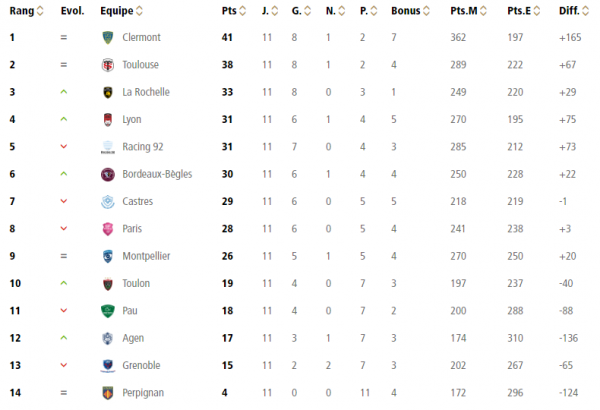 Après leur première victoire à l’extérieur, sur le terrain de Perpignan, nos joueurs remontent à la 6ème place du Top 14. Avec 30 points, ils sont même à seulement 3 points du Stade Rochelais, 3ème. La prochaine échéance en Top 14 sera le déplacement à Castres, chez notre futur manager, le 23 décembre prochain à 16h50. En attendant, place à la Challenge Cup et la double confrontation contre les Anglais de Sale.