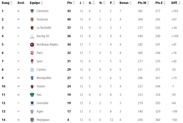 A la faveur de sa victoire en terres castraises, l’UBB remonte à la 5ème place du Top 14. Elle devance le Stade Français de deux points et Lyon de trois. Elle ne compte que deux points de retard sur le Racing, son adversaire du week-end prochain. Une victoire sera donc impérative pour terminer l’année sur une bonne note.