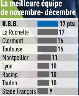 Dans l’Equipe du jour, on apprend qu’avec 17 points inscrits sur cette période, l’UBB est la meilleure équipe des mois de novembre et décembre. Elle est à égalité avec le Stade Rochelais et devance Clermont et Toulouse.