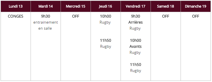 Après la défaite à Castres et alors qu’il y a un déplacement capital à préparer à Lyon mais 2 semaines pour cela, les joueurs ont une semaine d’entraînement allégée pour cette semaine. Ils sont en congés lundi. Mardi sera consacré à l’entrainement en salle. Mercredi sera une journée de repos, avant 2 journées d’entraînement jeudi et vendredi.