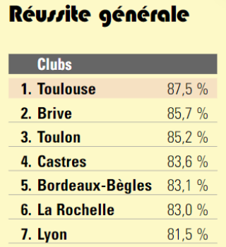 Avec 83,1% de réussite face aux perches, les buteurs de l’UBB sont les cinquièmes les plus réalistes de Top 14. Ils sont derrières, le Stade Toulousain, qui est en tête avec 87,5%, Brive, Toulon et Castres.
