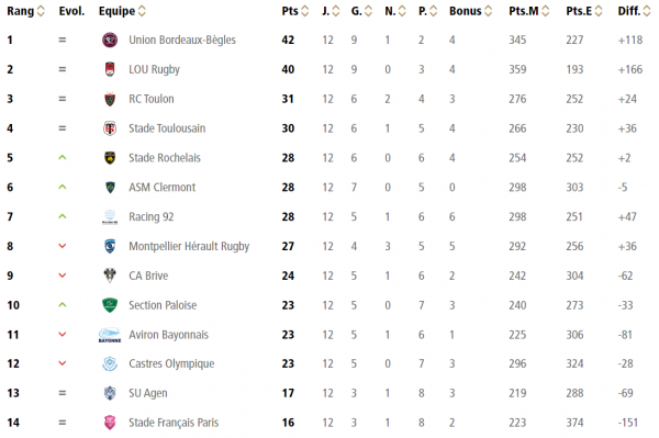 Après sa victoire sur le terrain de la Section Paloise, l’UBB terminera l’année 2019 en tête du Top 14. Avant de recevoir l’Aviron Bayonnais, le 4 janvier prochain au Stade Chaban Delmas à 20h45, notre équipe compte 2 points d’avance sur Lyon son dauphin et 11 sur Toulon, 3ème au classement. Elle compte aussi 14 points d’avance sur le 7ème, le Racing 92.