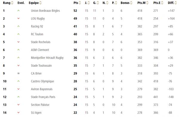 Après sa victoire sur sa pelouse de Chaban Delmas face aux Lyonnais, l’UBB reprend la tête du Top 14. A la faveur de son succès bonifié, elle compte désormais 3 points d’avance sur le LOU, mais aussi 11 sur le 3ème, le Racing et 16 points sur le 6ème, Clermont, qui sera son futur adversaire, samedi prochain à 20h45.