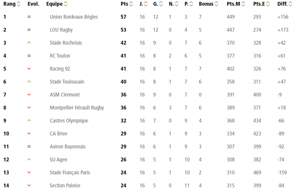 A la faveur de sa victoire bonifiée face à Clermont, l’UBB pointe toujours en tête du Top 14, mais elle a aussi creusé l’écart avec son dauphin lyonnais, puisque maintenant, elle compte 4 points d’avance. Elle compte aussi 15 points d’avance sur le 3ème, le Stade Rochelais et 21 points sur le 7ème, sa victime du week-end. Une bonne dynamique à confirmer à domicile face à l’ancien club de notre manager, Christophe Urios, le Castres Olympique, qui voudra surement prendre sa revanche de la défaite subie à domicile.