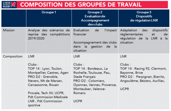Nous vous informions de la constitution par tirage au sort de trois groupes de travail par la LNR. Notre président, Laurent Marti, siégera dans celui qui réfléchira à l’accompagnement financier des clubs en cette période de suspension du championnat en raison de l’épidémie de Covid-19. Des réunions de travail régulières auront lieux lors du prochain mois avant une réunion du comité directeur le 7 avril prochain, pour prendre des premières décisions.